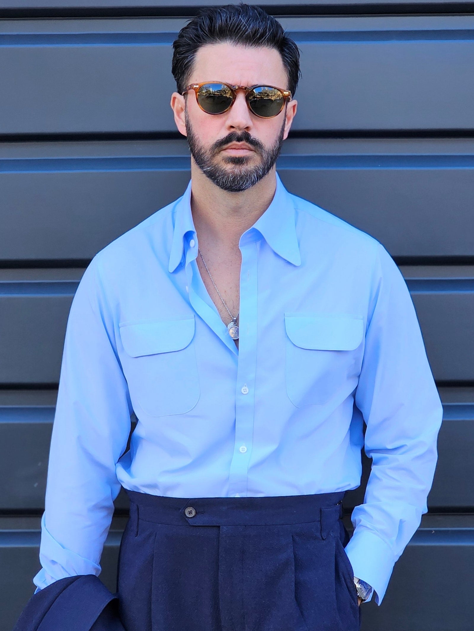 The light blue shirt follows naturally, offering variation without changing structure.